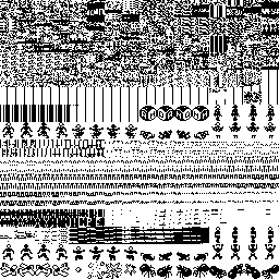 The image to the right is a graphical dump of game memery from 8000-BFFF. The sprite graphics are clearly visible. Each sprite is 16x16 pixels, represented by 64 bytes of data. For each pixel row (they're stored top-to-bottom), the four bytes are:
