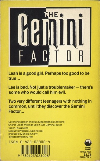 The Gemini Factor was a children's fantasy drama series made by Thames Television in 1987. Very few people have ever heard of it, so way back in the late 1990s I thought it deserved a web page. Said web page languished on my ISP's web server for the better part of two decades, until they deleted it, so I have resurrected it here in a slightly updated form.