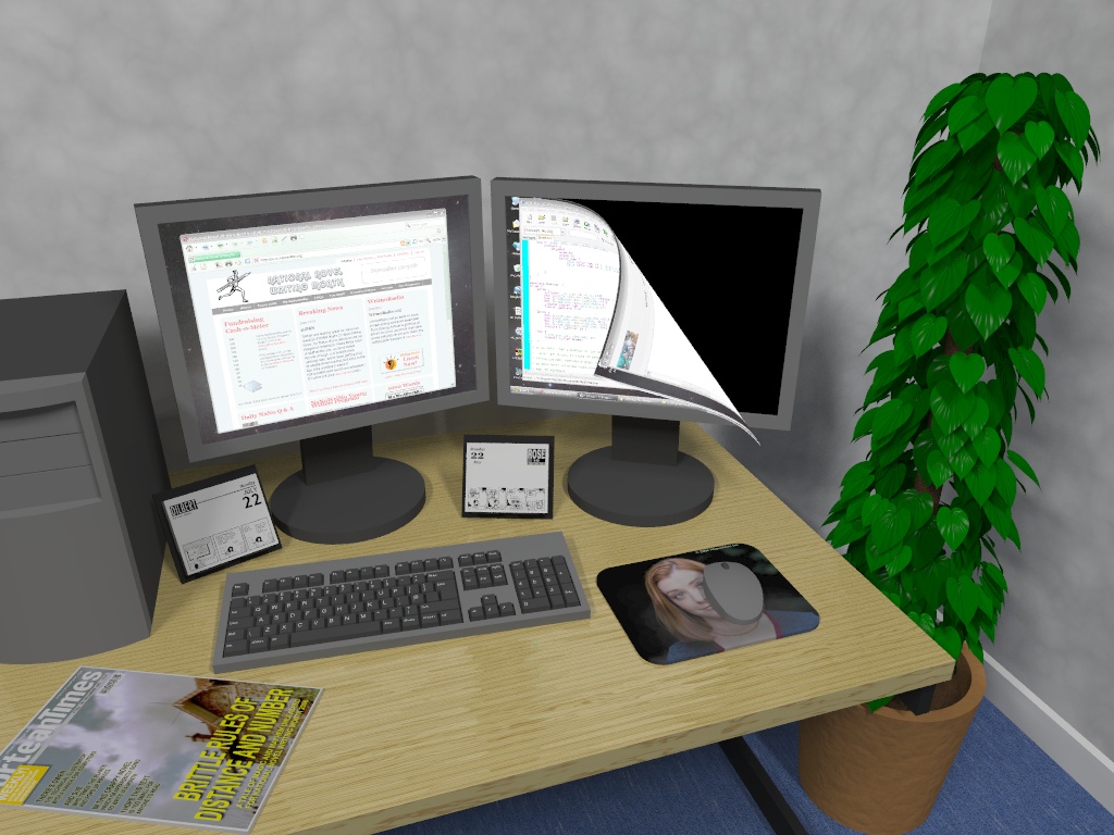 This one (below) is unfinished, but was intended to be cover art for my 2006 NaNoWriMo entry, Brittle Rules of Distance and Number. It was rendered in the POV-Ray, the Persistance of Vision Raytracer. The pot plant was generated procedurally and based on one from my workplace.