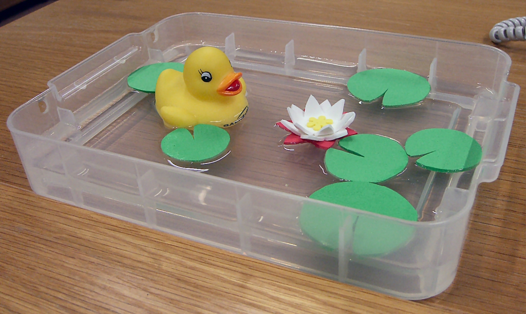 An attempt to cheer up a co-worker. Her rubber duck, my box lid, craft foam, and actual water. Actual water sitting in an office accumulates a disturbing amount of formerly-airborne crud, so it didn't last long.